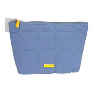 Bolsa de cosméticos azul acolchada a cuadros con logotipo personalizado, bolsa de almacenamiento de viaje para el cuidado de la piel, tamaño pequeño para mujer